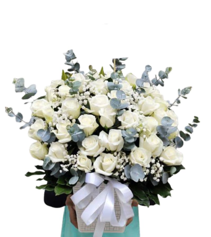 Hoa hồng trắng không chỉ là biểu tượng của tình yêu và sự thuần khiết mà còn mang ý nghĩa tôn kính và lòng đau thương. Điều này khiến cho giỏ hoa trở thành sự lựa chọn phổ biến trong các dịp đám tang.Cách Đặt Hàng