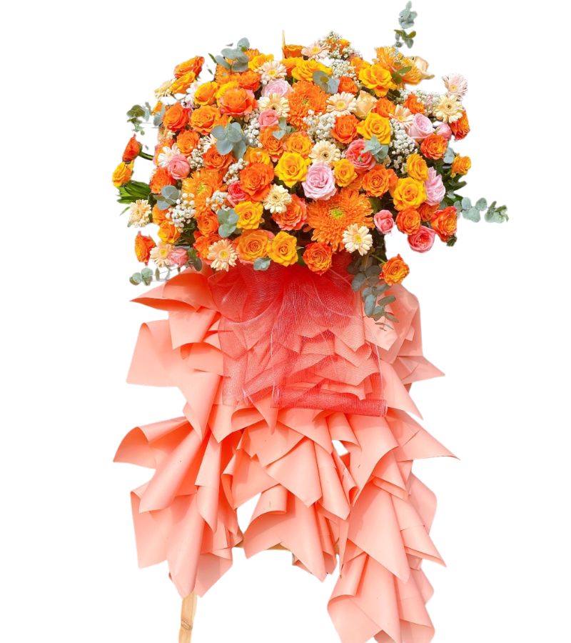 - Thiết kế độc đáo: Kệ hoa với form chắc tay, phối màu nổi bật giữa tông cam và vàng tạo cảm giác tươi mới, vui vẻ, phù hợp cho không khí khai trương.