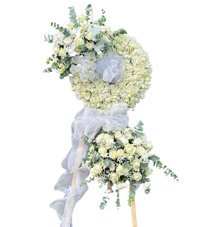 Với sắc trắng tinh khôi, Vòng Hoa Mix Trắng Sang – Trang Trọng không chỉ thể hiện sự tôn trọng mà còn mang lại cảm giác an lành cho gia đình người mất. Sản phẩm phù hợp cho nhiều địa điểm như đám tang, lễ tưởng niệm hay các sự kiện tương tự.